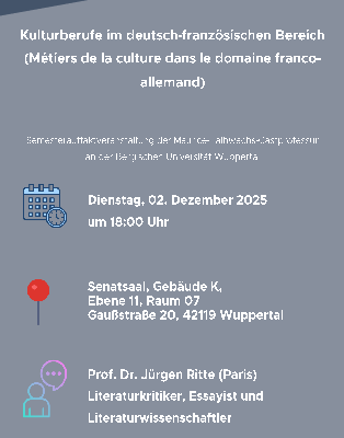 auf diesem Wege möchte ich Sie auf die erste Veranstaltung der Reihe "Kulturberufe im deutsch-französischen Bereich" im Rahmen der Maurice Halbwachs-Gastprofessur hinweisen. Am Dienstag, dem 2. Dezember 2025 um 18:00 Uhr stellt Prof. Dr. Jürgen Ritte (Paris) den Beruf des Übersetzers vor. Die Veranstaltung, zu der Sie herzlich eingeladen sind, findet in Raum K.11.07 (Senatssaal) auf dem Campus Grifflenberg statt.